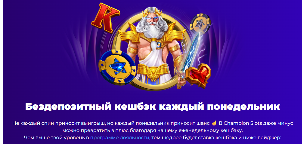 - VIP-программа Champion Status: Многоуровневая система лояльности, открывающая перед активными игроками эксклюзивные возможности: персональный менеджер, повышенные лимиты на вывод, индивидуальные подарки.